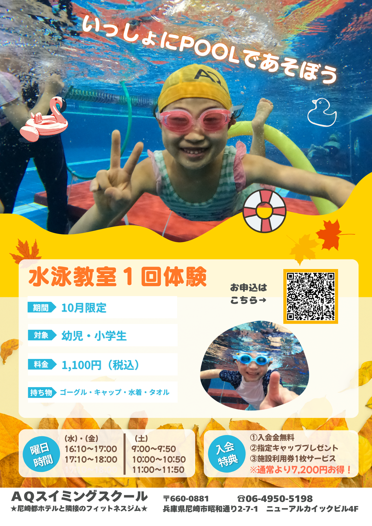 ★スイミング1回体験★ スイミング1回体験 好評受付中! ネット予約は「参加する」をクリックしてください。 参加する AQフィットネスクラブ尼崎 スイミングの特徴: ①アクアプレイ(幼児期運動指針を基に作成された水泳指導プログラム) ②少人数指導 ③プールか待機室で参観OK ④無料WIFI完備 ⑤入会後、スクール中待機されている保護者はプールもジムも使い放題