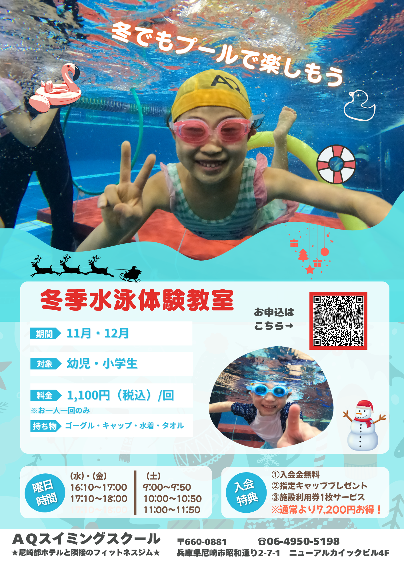 ★スイミング1回体験★ スイミング1回体験 好評受付中! ネット予約は「参加する」をクリックしてください。 参加する AQフィットネスクラブ尼崎 スイミングの特徴: ①アクアプレイ(幼児期運動指針を基に作成された水泳指導プログラム) ②少人数指導 ③プールか待機室で参観OK ④無料WIFI完備 ⑤入会後、スクール中待機されている保護者はプールもジムも使い放題
