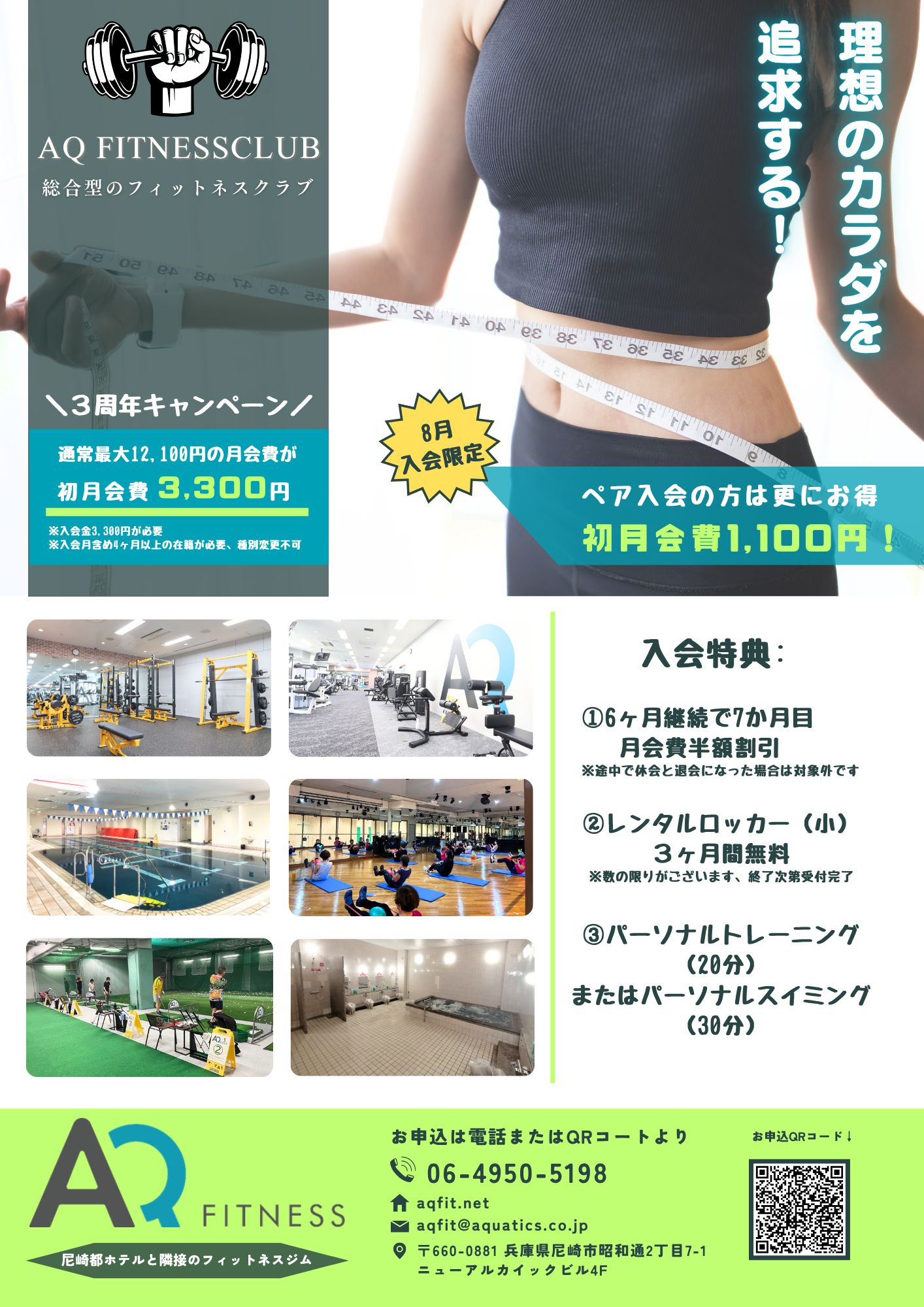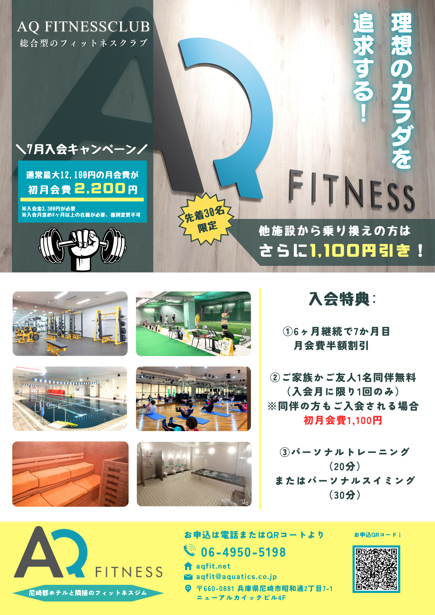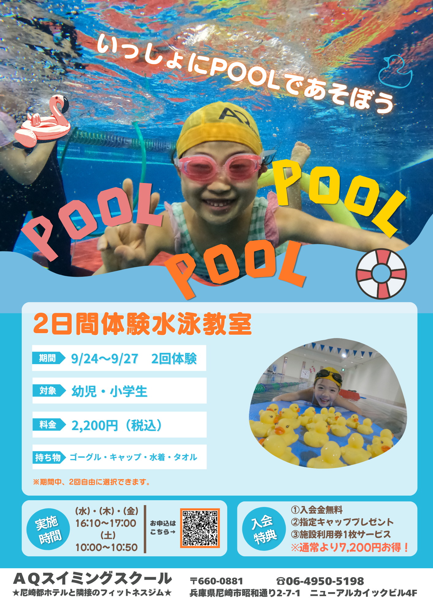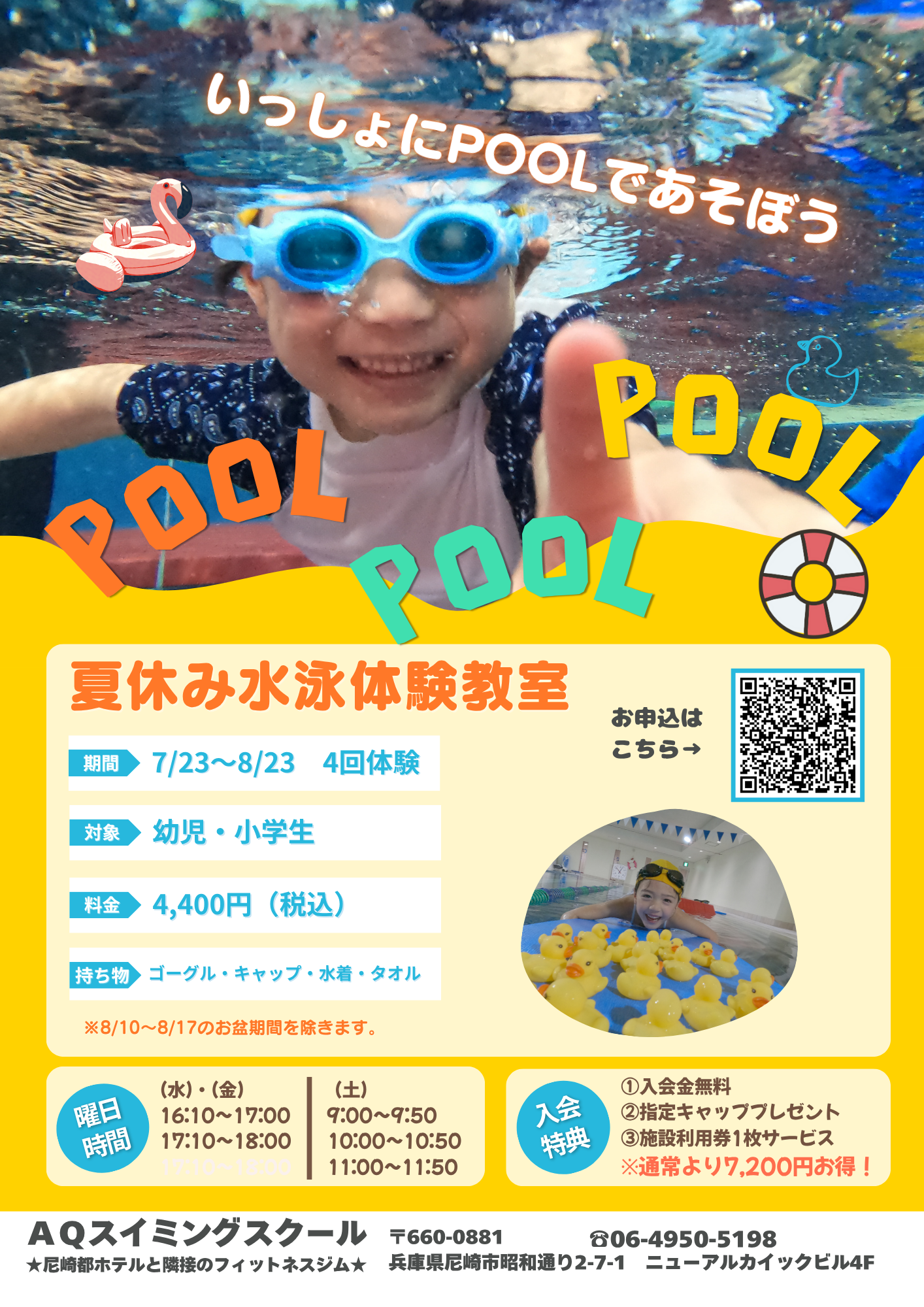 ★夏休み水泳体験教室★ 夏休み水泳体験教室☆彡 受付スタート! ネット予約は「参加する」をクリックしてください。 参加する AQフィットネスクラブ尼崎 スイミングの特徴: ①アクアプレイ(幼児期運動指針を基に作成された水泳指導プログラム) ②少人数指導 ③プールか待機室で参観OK ④無料WIFI完備 ⑤コーチは全員水泳資格保有者 ⑥入会後、スクール中待機されている保護者はプールもジムも使い放題