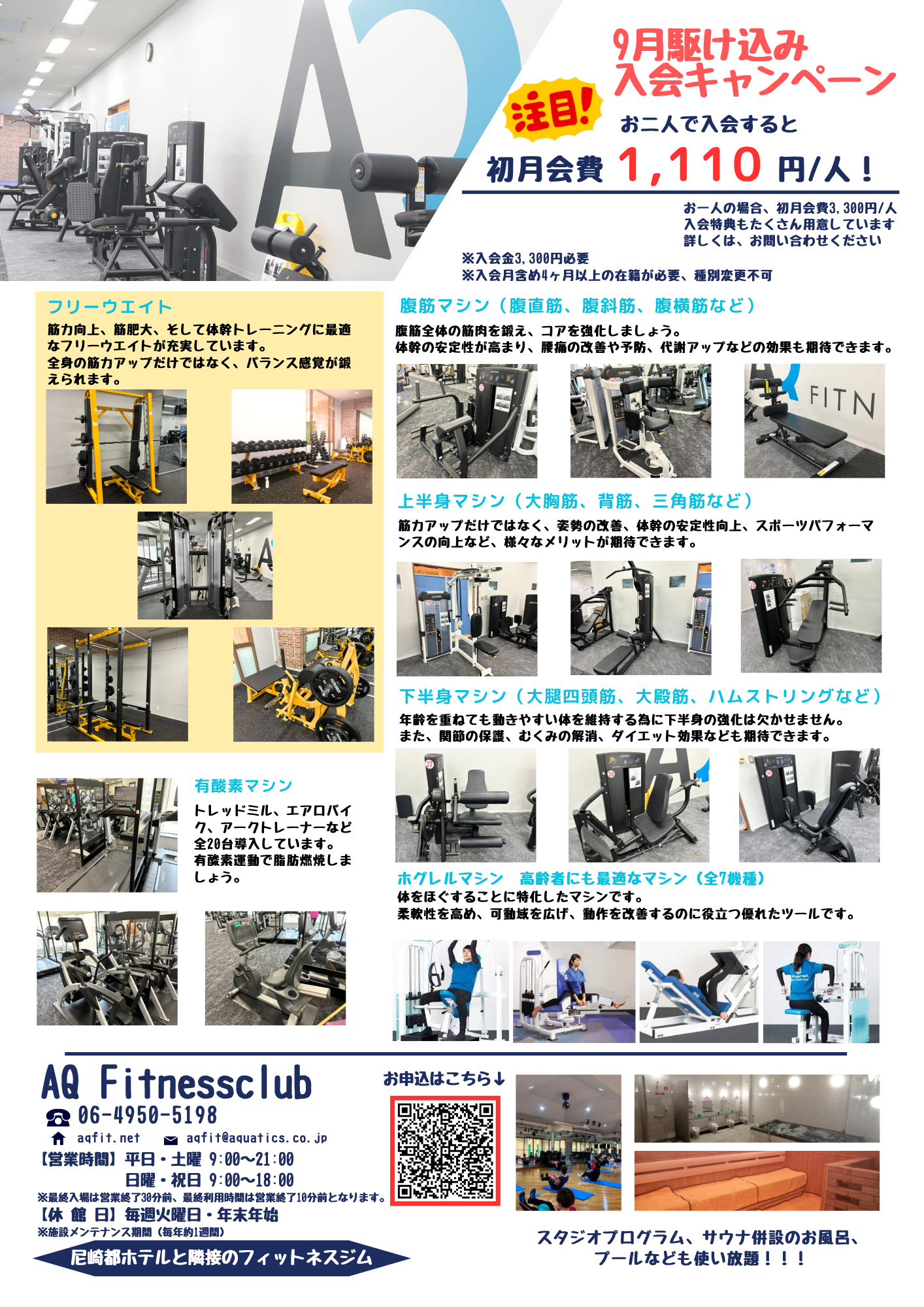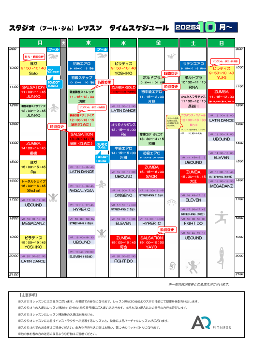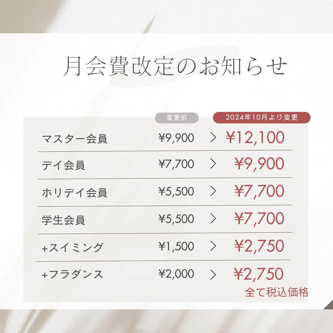 会費改定のお知らせ 平素よりAQフィットネスクラブをご利用いただき誠にありがとうございます。 この度、2024年10月から会費を改定させていただくこととなりました。 ご理解を賜りますようお願い申し上げます。