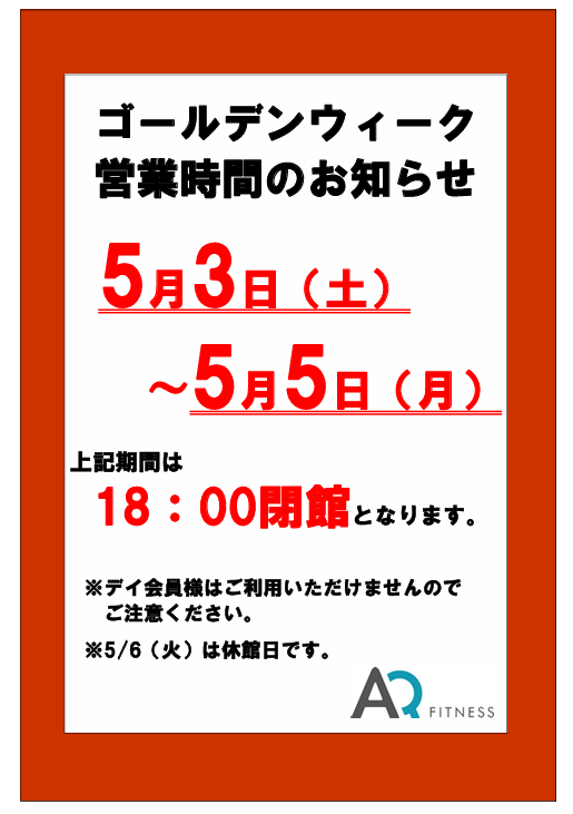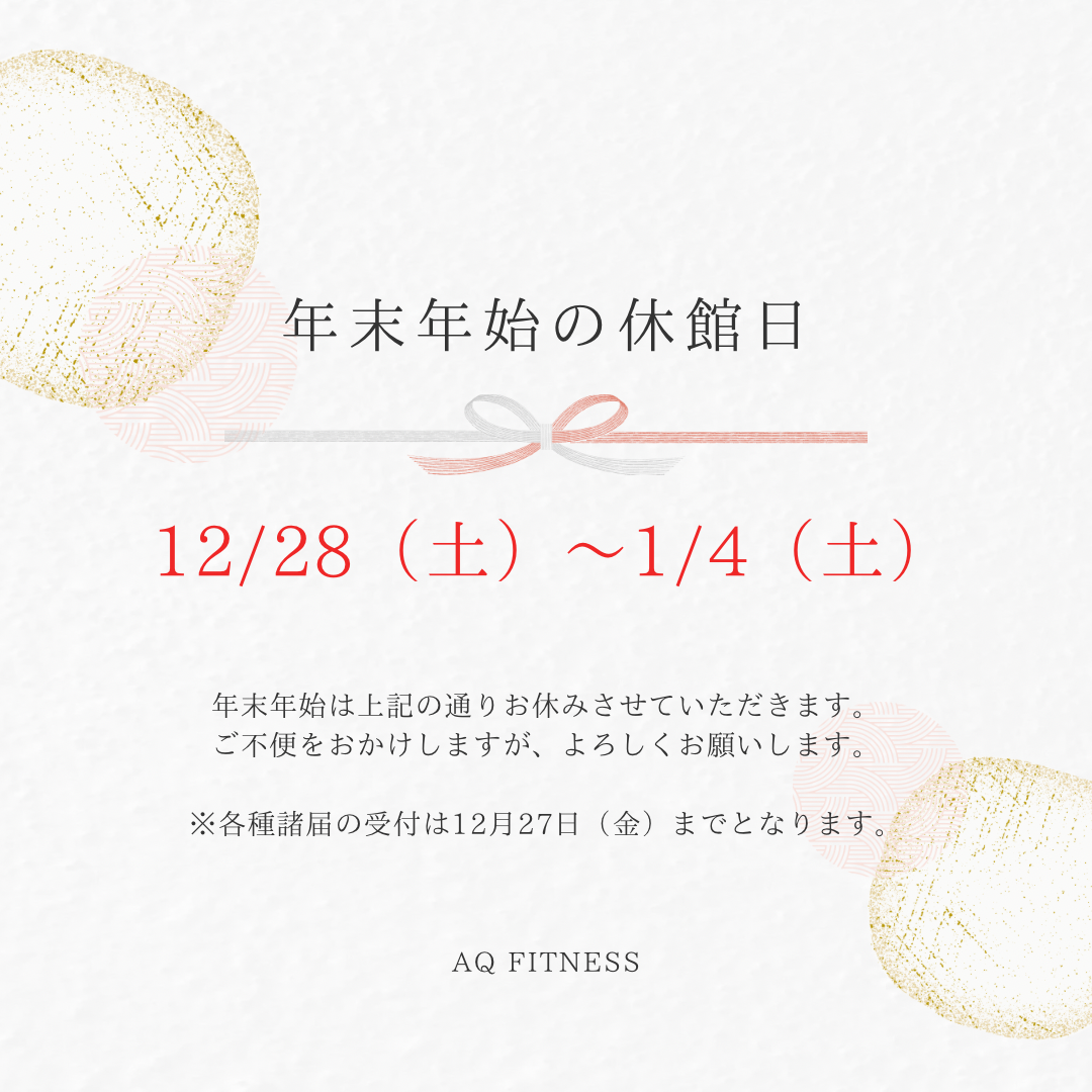 あけましておめでとうございます あけましておめでとうございます。AQフィットネスクラブは2025年1月5日(日)9:00より営業を開始いたします。営業時間は通常通りです。皆様のお越しをお待ちいたしております。