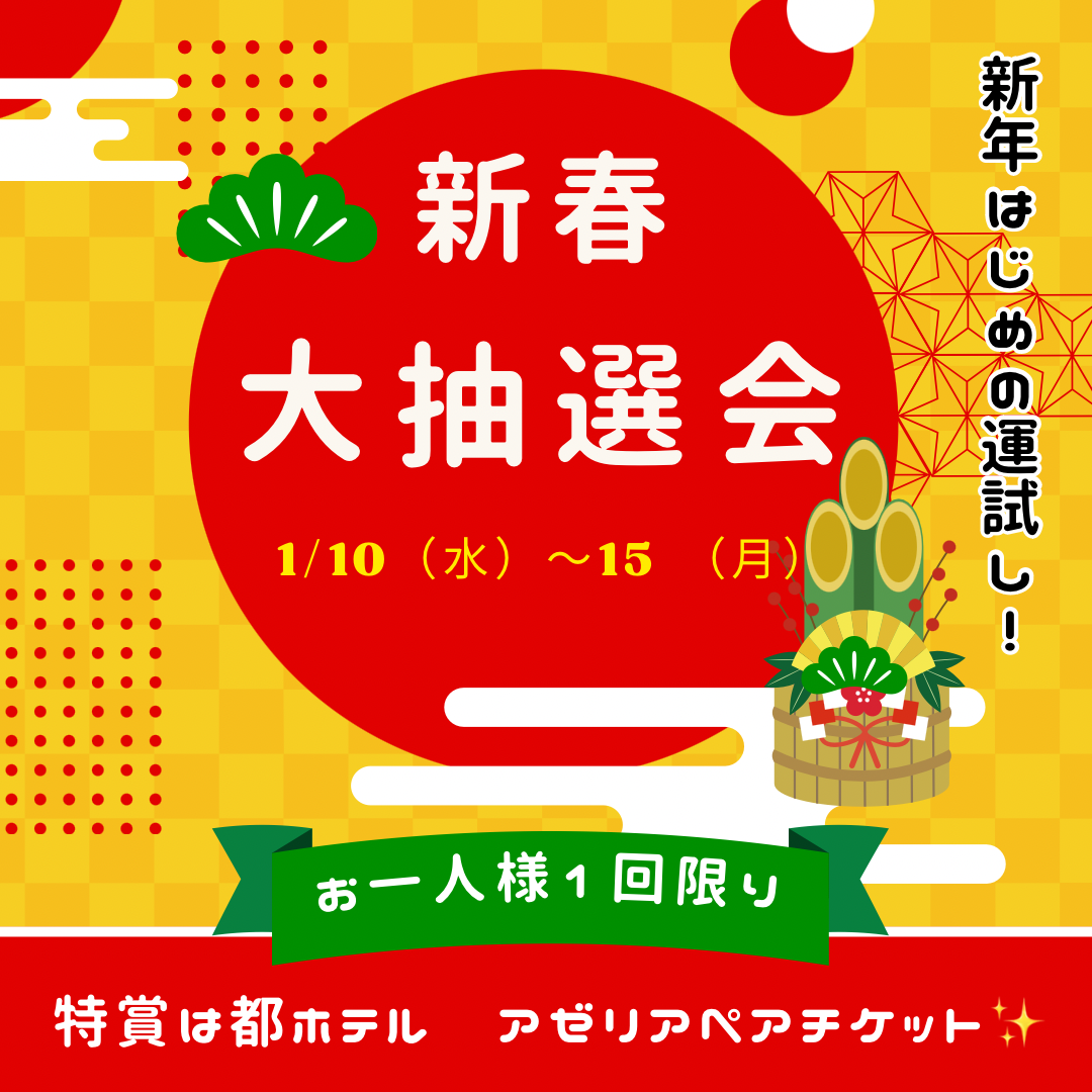 新春抽選会 1月10日(水)~1月15日(月)期間限定新春くじ引き 特賞:都ホテル尼崎~アゼリアレストランのペアチケット(15,000円相当) 他にもたくさん景品をご用意しております。 会員お一人様につき1回限り!是非とも、その前に入会して、開運景品をゲットしましょう!