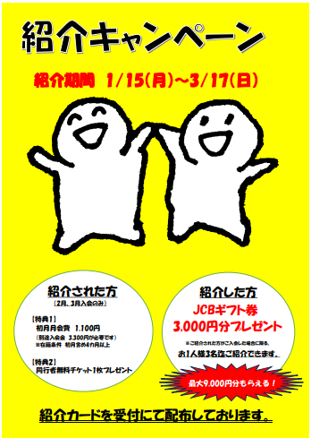 紹介キャンペーン 1月15日(月)~3月17日(日) 期間限定(2月入会と3月入会のみ) 紹介された方の特典:初月会費1,100円と同行者無料チケット1枚プレゼント 紹介した方の特典:1名に対し、JCBギフト券3,000円プレゼント この機会を使い、お友達と一緒に運動生活を楽しもう!