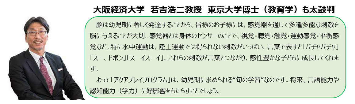 文部科学省が推奨する幼児期運動指針の動きを水泳に取り入れた「AQUAPLAYPLOGRAM」を実施します。